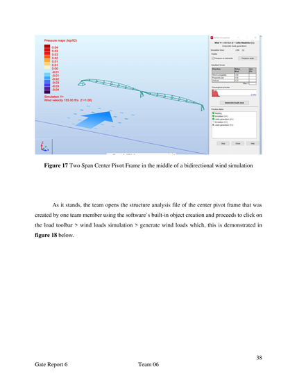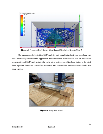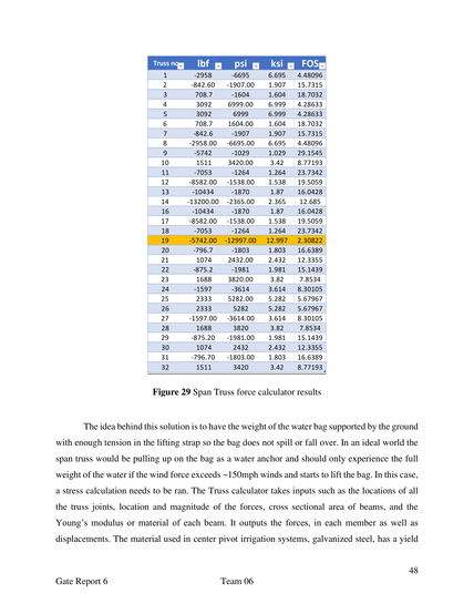 The team was able to elude that lift was generated on the current standard model of center pivots and that their theoretical solution of a water bag anchor in the center of the pivot in addition to a wider base with structural cables attached to the center (dubbed the spider design) eradicated the lift and made the pivot significantly more stable in high winds. In addition, the team was able to justify simulation results by creating a physical model of testing and recreating said models in the same software. There was no plan to go full-scale with the team’s proposed solutions. Actual implementation on a center pivot should fall to the manufacturer and their research and development teams in the future alongside the transition from a theoretical design to a ready-to-manufacture design. Overall, the wind tunnel, and simulations the team constructed were ready to be a deliverable to hand off to the client for them to take to their supplier and have a conversation about the development of additional augmentations to their lineup of center pivot irrigators.